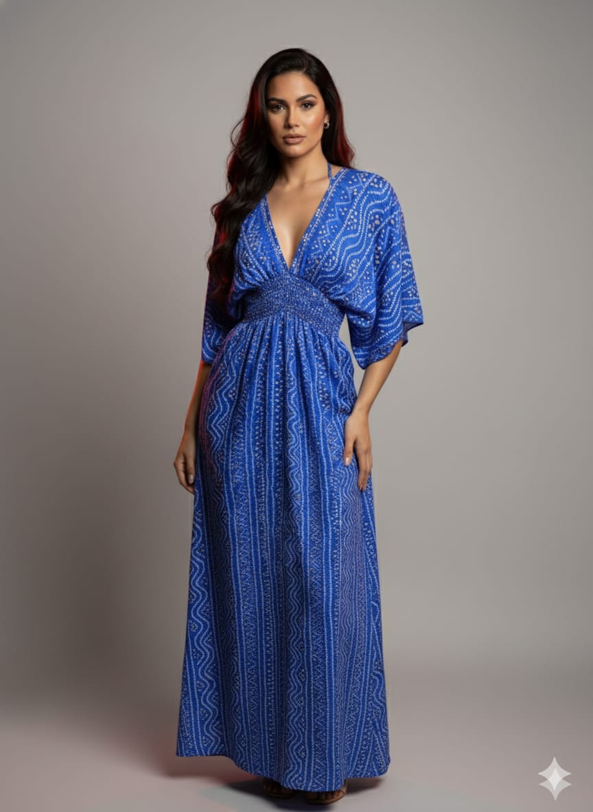 This maxi dress stands out for its vibrant and detailed print, reminiscent of paisley or floral motifs in intense tones like fuchsia pink, teal blue, and grey touches on a light background. Its design features a flattering deep V-neck and elegant wide batwing (dolman) sleeves that reach the elbow or 3/4, providing a fluid and comfortable silhouette. The waist is delicately smocked, creating an elastic fit that enhances the figure without sacrificing comfort and allowing the skirt to fall gracefully to the floor.